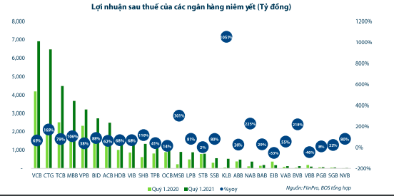 Tổng lợi nhuận sau thuế các ngân hàng niêm yết trong quý 1/2021 đạt 41.876 tỷ đồng tăng 77% so với cùng kỳ năm trước và ở mức kỷ lục từ trước đến nay nhờ biên lãi ròng NIM được cải thiện và Thông tư 03 của Ngân hàng Nhà nước cho phép các ngân hàng được trích lập dự phòng kéo dài trong 4 năm và giữ nguyên nhóm nợ với nhiều khoản vay bị ảnh hưởng của Covid 19 đã giảm áp lực về khoản chi phí này với các ngân hàng.