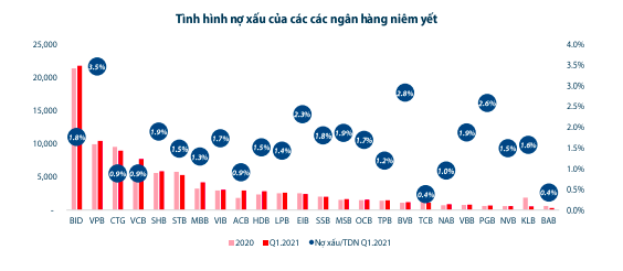 Đối với nợ xấu, theo thống kê, nợ xấu của các ngân hàng tăng nhẹ so với cuối năm 2020. Tổng giá trị nợ xấu của các ngân hàng hiện đang niêm yết đạt 91.244 tỷ đồng vào ngày 31/3/2021, tăng 3.948 tỷ đồng so với cuối năm 2020. Tỷ lệ nợ xấu/tổng dư nợ cũng tăng nhẹ 0,02 điểm phần trăm lên mức 1,41%.