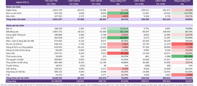 Nhìn chung, bức tranh lợi nhuận quý IV/2025 cho thấy mức tăng trưởng 52,54% so với cùng kỳ năm trước, còn lũy kế cả năm đạt mức tăng 34,83%. Đà cải thiện chủ yếu đến từ khối tài chính, nổi bật là các ngân hàng, cùng với sự phục hồi rõ nét của nhóm Bất động sản và Dầu khí. Trong khi đó, một số lĩnh vực tiêu dùng - dịch vụ vẫn chịu sức ép và chưa thực sự bứt phá.
