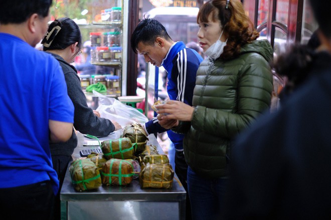 Trong tiết trời se lạnh của những ngày cận Tết, nhiều người dân vẫn kiên nhẫn xếp hàng trên phố Hàng Bông để mua bằng được những chiếc bánh chưng và giò chả nóng hổi tại một cửa tiệm nức tiếng Hà Nội.