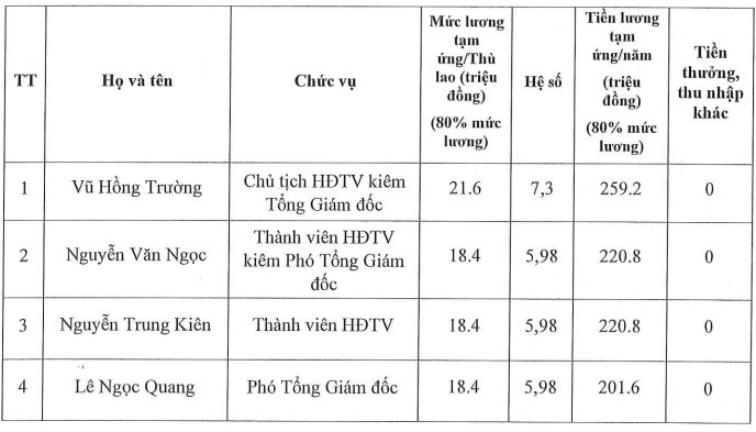 Như vậy, tiền lương tạm ứng của ông Trường trong năm 2023 là 259,2 triệu đồng, ông Ngọc và ông Kiên là 220,8 triệu đồng và ông Quang là 201,6 triệu đồng.
