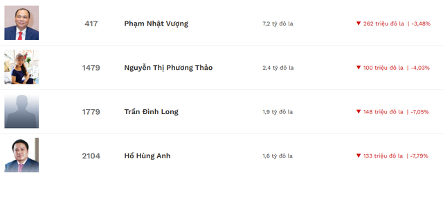 Tính chung, 4 tỉ phú USD của Việt Nam đã mất 643 triệu USD giá trị tài sản so với phiên trước, tương đương hơn 16.700 tỉ đồng.