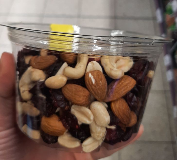 Đó là một món ăn nhẹ rất phổ biến vì hương vị ngon, trông đẹp mắt và khiến chúng ta tự tin rằng mình đang ăn một thứ gì đó tốt cho sức khỏe. Tuy nhiên, bạn nhìn kỹ thành phần của gói sẽ thấy rằng phần chính của sản phẩm này là trái cây rẻ tiền, đậu phộng và nho khô. Thực tế có loại hạt đắt tiền như hạnh nhân hoặc hạt điều nhưng rất ít.