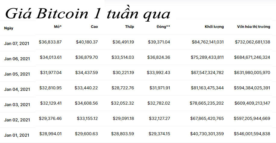 Bitcoin đạt mức cao nhất mọi thời đại, lên trên 40.000 USD chưa đầy một tháng sau khi phá vỡ mức 20.000 USD. Kể từ đợt tăng gần đây nhất vào tháng 10, giá trị của Bitcoin đã tăng gấp 4 lần. Vốn hóa của thị trường tiền ảo toàn cầu vượt 1.000 tỷ USD lần đầu tiên hôm 7/1. Trong đó, riêng Bitcoin đóng góp hơn 700 tỷ USD.