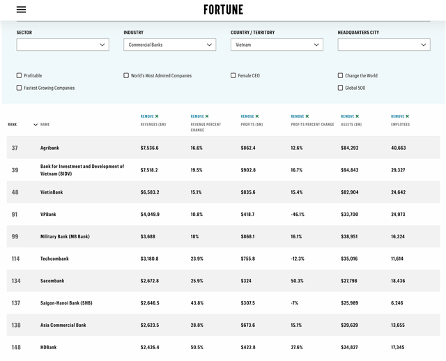 Một ngân hàng khác trong "Big4" có mặt trong xếp hạng của Fortune là VietinBank. Trên bảng xếp hạng này, VietinBank đứng vị trí 48 và nằm trong top 5 doanh nghiệp lớn nhất Việt Nam theo bảng xếp hạng của Fortune.