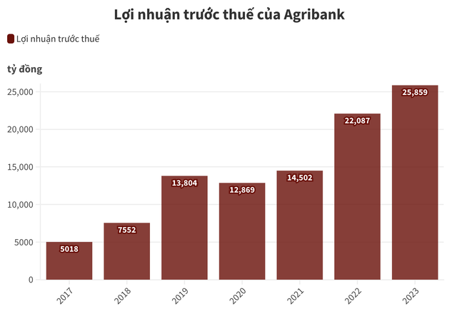 Số liệu thể hiện trên báo cáo tài chính này của nhà băng này cho thấy, trong năm 2023, tổng tài sản của Agribank vượt mốc 2 triệu tỷ đồng; nguồn vốn đạt trên 1,88 triệu tỷ đồng. Tổng dư nợ cho vay nền kinh tế đạt trên 1,55 triệu tỷ đồng. Lợi nhuận trước thuế cả năm của đạt hơn 25.859 tỷ đồng, tăng gần 15%.
