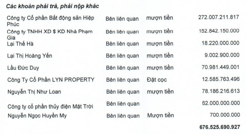 Một số doanh nghiệp là bên liên quan cũng cho mượn số tiền lớn, như Công ty cổ phần Bất động sản Hiệp Phúc (272 tỷ đồng), Công ty TNHH Xây dựng và Kinh doanh Nhà Phạm Gia (gần 153 tỷ đồng), Công ty cổ phần thủy điện Mặt Trời (62 tỷ đồng).