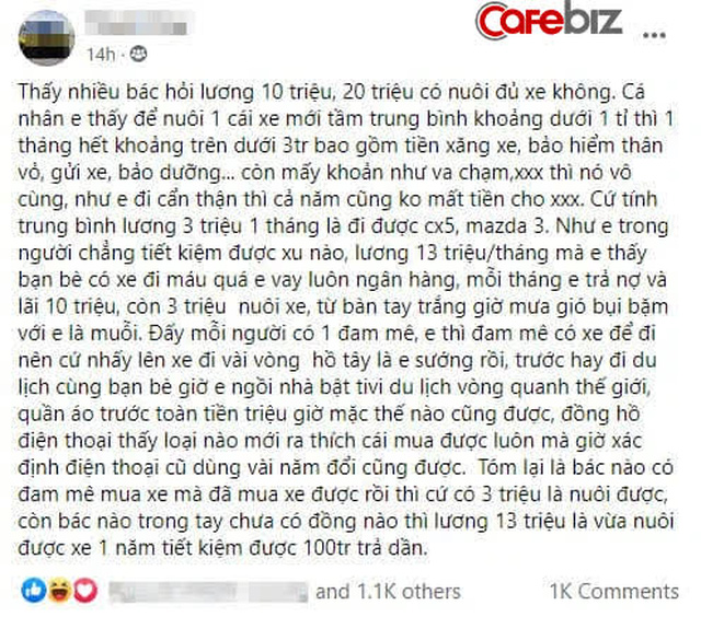 Đồng thời tự loại bỏ các khoản như va chạm trên đường với lý do bản thân lái xe cẩn thận và có mua bảo hiểm. "Cứ tính trung bình lương 3 triệu/tháng là mua được xe... Như em trong người chẳng tiết kiệm được xu nào, lương 13 triệu đồng/tháng mà em thấy bạn bè có xe đi. Em vay ngân hàng, mỗi tháng em trả nợ và lãi 10 triệu, còn 3 triệu nuôi xe. Từ ban tay trắng, giờ mưa gió, bụi bặm với em là muỗi...", anh chàng này kể.