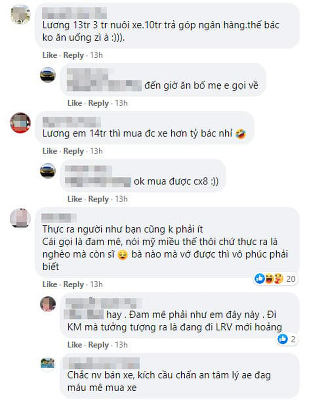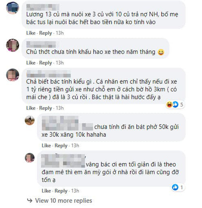 - Lương 13 triệu, 3 triệu nuôi xe, 10 triệu trả góp ngân hàng. Thế bác có định ăn uống không hay hít khí trời để sống?