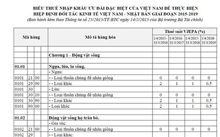 | Biểu thuế nhập khẩu ưu đãi đặc biệt của Việt Nam để thực hiện Hiệp định Đối tác kinh tế Việt Nam - Nhật Bản giai đoạn 2015-2019 dài 451 trang. |