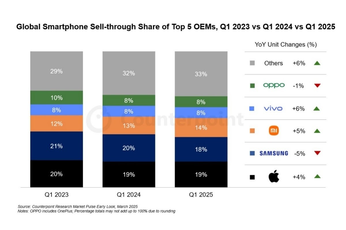 Trong khi Apple tăng 4% doanh số từ quý 1/2024 đến quý 1/2025, Samsung lại giảm 5%. Xiaomi đã ghi nhận mức tăng 5% về lượng hàng xuất xưởng, nâng thị phần lên 14%. Vivo cũng có sự tăng trưởng 6%, vượt qua Oppo, trong khi danh mục “khác” với các thương hiệu như Honor, Huawei và Motorola cũng ghi nhận mức tăng trưởng 6%.