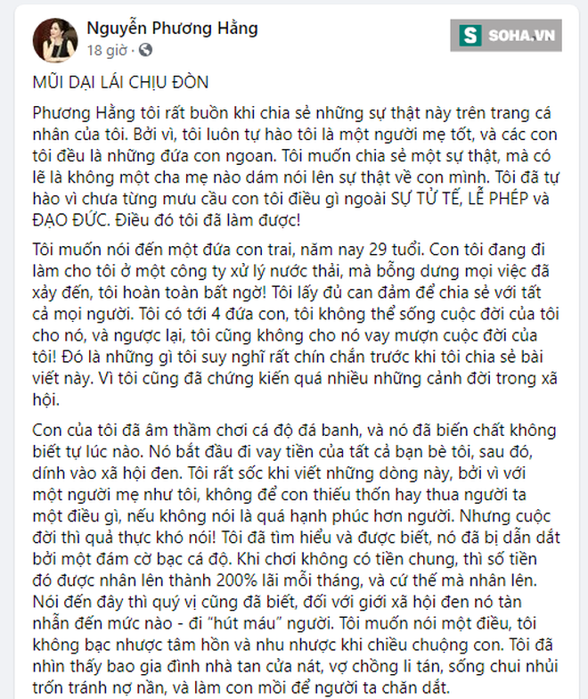 Trên Facebook cá nhân, bà Nguyễn Phương Hằng - Phó Chủ tịch Hội đồng quản trị, CEO của Công ty cổ phần Đại Nam vừa công khai một sự thật đau lòng. Theo lời bà Hằng, con trai bà đã âm thầm chơi cá độ đá banh, vay tiền bạn bè của mẹ và dính vào xã hội đen.