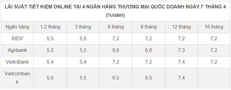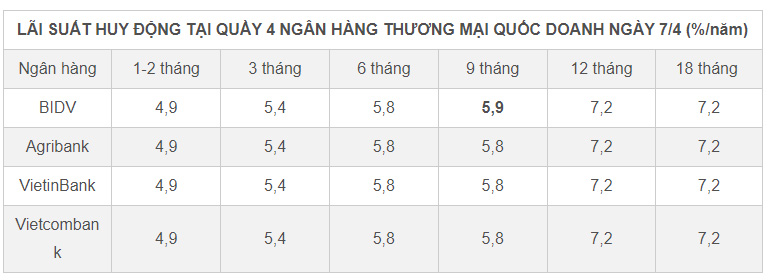Ngoại trừ, kỳ hạn 9 tháng được BIDV áp dụng mức lãi suất 5,9%/năm. Ba ngân hàng còn lại áp dụng mức lãi suất 5,8%/năm cho kỳ hạn này.