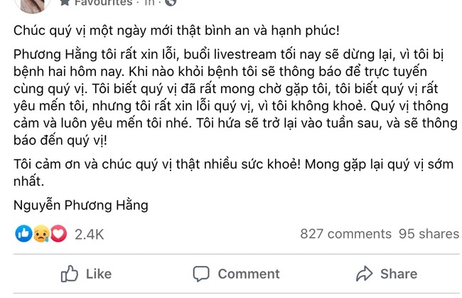 Phương Hằng tôi rất xin lỗi, buổi livestream tối nay sẽ dừng lại, vì tôi bị bệnh hai hôm nay. Khi nào khỏi bệnh tôi sẽ thông báo để trực tuyến cùng quý vị. Tôi biết quý vị đã rất mong chờ gặp tôi, tôi biết quý vị rất yêu mến tôi, nhưng tôi rất xin lỗi quý vị, vì tôi không khoẻ. Quý vị thông cảm và luôn yêu mến tôi nhé. Tôi hứa sẽ trở lại vào tuần sau, và sẽ thông báo đến quý vị! Tôi cảm ơn và chúc quý vị thật nhiều sức khoẻ! Mong gặp lại quý vị sớm nhất.