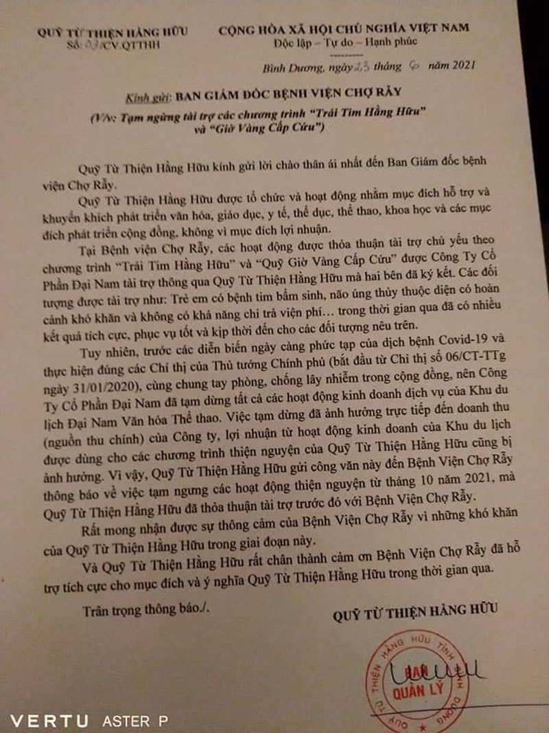 Trong diễn biến khác, trước khi các văn bản tạm ngừng tài trợ được công khai, bà Nguyễn Phương Hằng đã viết tâm thư bày tỏ nỗi lòng trên trang cá nhân. Theo đó, bà Hằng cho biết Quỹ mổ tim Hằng Hữu trong 7 năm qua đã cứu sống hàng nghìn trái tim và bà mong rằng Quỹ thiện nguyện sẽ kéo dài đến khi con trai bà là Hằng Hữu trưởng thành.