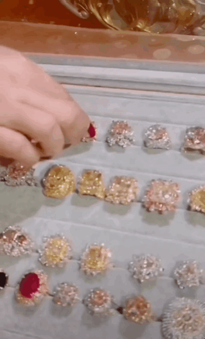 Theo đó, chính bà Phương Hằng đã nhờ cấp dưới là nhân viên Đại Nam, quay cận cảnh BST kim cương của mình và con gái. Bà khẳng định "đây mẹ một mâm, con gái một mâm". Sau đó là hàng loạt những chiếc nhẫn kim cương nước D có giá trị cực kì cao. Được biết, để đo lường rõ hơn về giá trị của kim cương, các hãng kim hoàn trên thế giới đã chia ra bảng chữ cái từ D đến Z (D là kim cương cao cấp nhất - Z thì... dễ tìm dễ mua). Trong đó, kim cương tự nhiên nước D là loại hoàn toàn không màu. Đây là kim cương cao cấp nhất, đắt nhất và hiếm nhất!