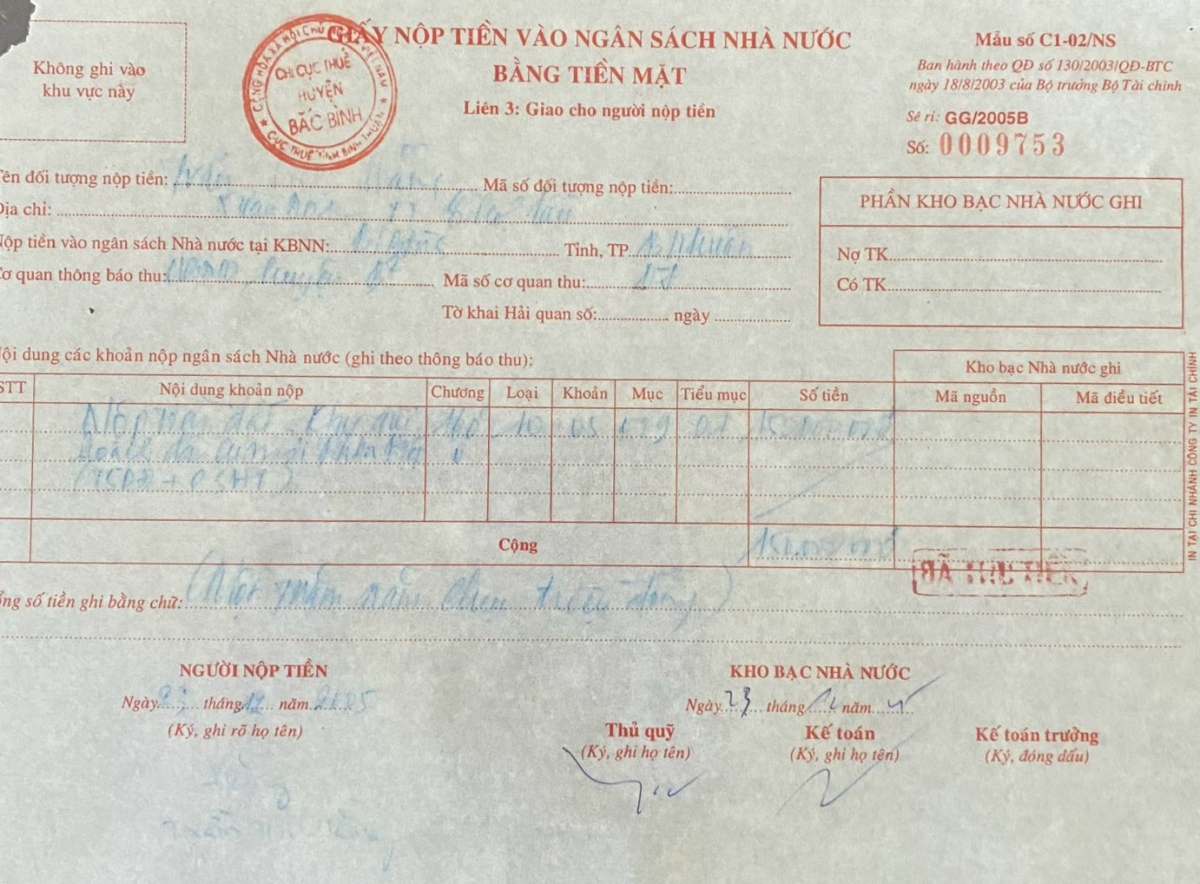 Theo biên bản UBND huyện Bắc Bình và UBND xã Phan Hiệp yêu cầu bà Hằng phải nộp tiền 1 lần vào ngày 23/12/2005 và khi nộp tiền, huyện sẽ giao đất thực tế và giấy chứng nhận quyền sử dụng đất khu đất nêu trên.