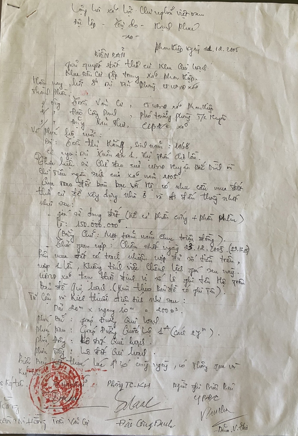 Biên bản làm việc ghi rõ: “Do áp lực đạt chỉ tiêu ngân sách thời điểm cuối năm 2005 nên UBND xã Phan Hiệp phối hợp với các ngành của huyện tổ chức bán đất cho bà Trần Thị Hằng để nộp ngân sách; toàn bộ số tiền bà Trần Thị Hằng mua đất (150.000.000 đồng) đã nộp ngân sách đầy đủ”.