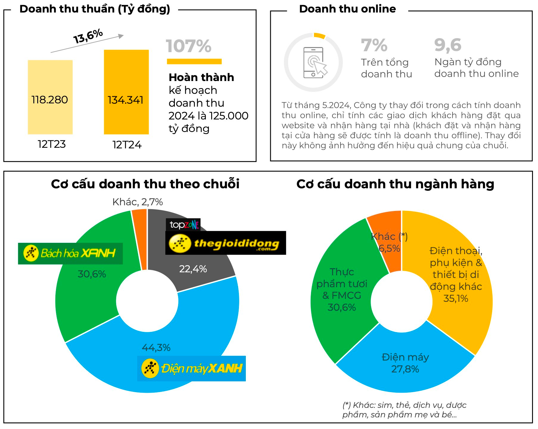 Về cơ cấu, trong năm 2024, chuỗi Thế Giới Di Động (TGDĐ, bao gồm Topzone) đóng góp 30.000 tỷ đồng và Điện Máy Xanh (ĐMX) đóng góp 59.500 tỷ đồng, lần lượt chiếm 22,4% và 30,6% tổng doanh thu. Trong đó, doanh thu online đạt gần 8.700 tỷ đồng, chiếm khoảng 10% tổng doanh thu 2 chuỗi.