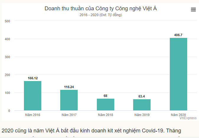 Trong bốn năm từ 2016 đến 2019, hoạt động của Việt Á có xu hướng giảm dần khi doanh thu từ mức 166 tỷ giảm về còn 63 tỷ đồng. Tuy nhiên, chỉ tiêu này đã tăng vọt lên hơn 400 tỷ đồng vào năm 2020, gấp hơn 6 lần năm 2019.