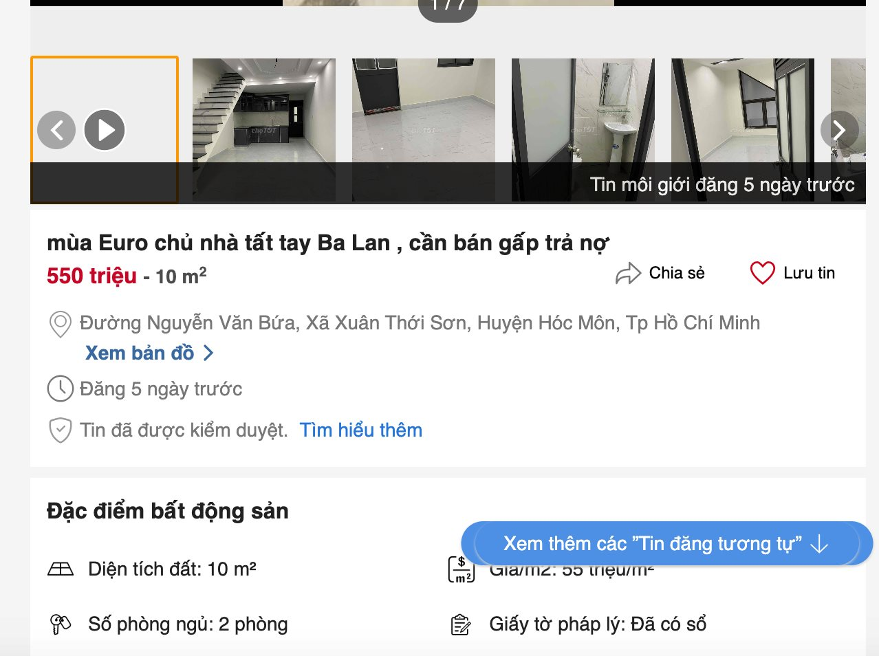 Cách đây vài ngày, môi giới đăng tin trên nhatot.vn với nội dung “mùa Euro chủ nhà tất tay Ba Lan, cần bán gấp trả nợ” kèm thông tin căn nhà 10m2 tại đường Nguyễn Văn Bứa, Xã Xuân Thới Sơn, Huyện Hóc Môn rao với giá 550 triệu đồng.