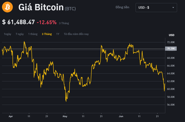 Tính đến 10 giờ 30 ngày 25-6 (theo giờ Việt Nam), đồng Bitcoin (BTC) tiếp tục giảm gần 5%, lùi sát mốc 60.000 USD/BTC (tương đương 1,5 tỉ đồng) - vùng giá thấp nhất trong 3 tháng qua.