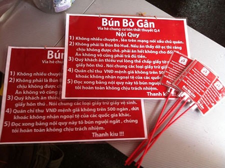 01/04/2015 22:54Bảng "nội quy" hài hước đã được trả lại cho chủ quán bún bò gân