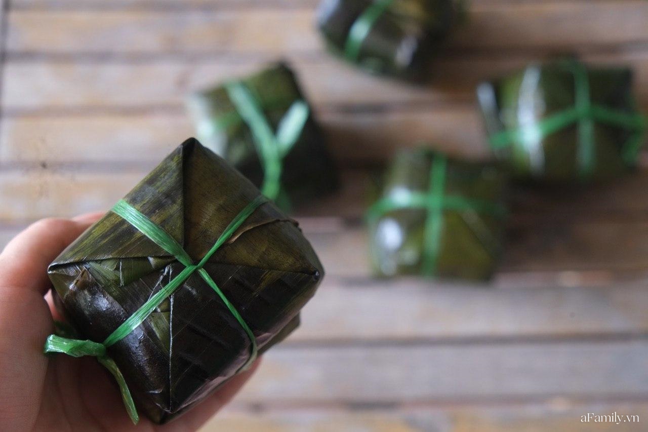 Bánh chưng tiêu mini này được gói trong 3 lớp lá và cách gói khác với bánh chưng truyền thống ngoài Bắc nên nếu không cẩn thận thì khi bóc sẽ làm bánh bị nát.