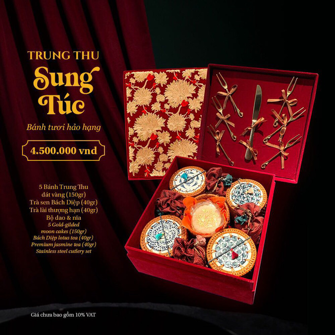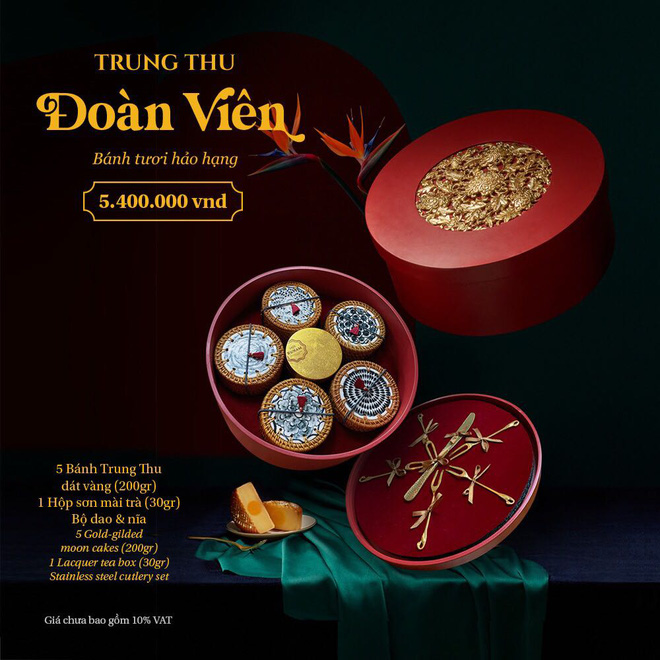 Hộp bánh trung thu gồm 5 bánh dát vàng, một hộp sơn mài trà 30 gram cùng với dao và nĩa đang được bán với giá 5.200.000 đồng/hộp tại TPHCM.