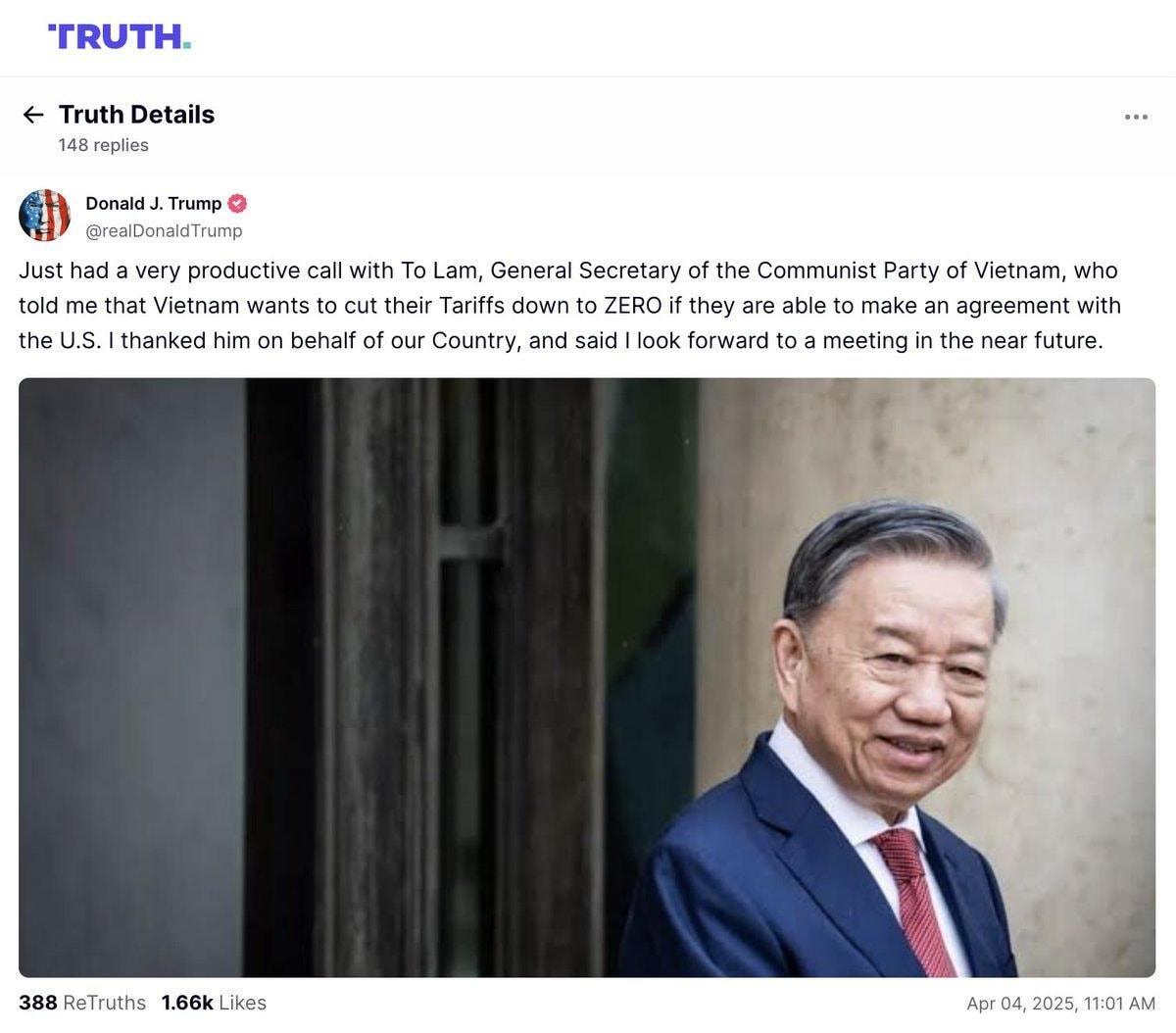 Theo TTXVN, tối 4/4, Tổng Bí thư Tô Lâm đã có cuộc điện đàm với Tổng thống Hoa Kỳ Donald J.Trump về quan hệ Việt Nam – Hoa Kỳ. Tham dự điện đàm có Thủ tướng Chính phủ Phạm Minh Chính, Chánh Văn phòng Trung ương Đảng Lê Hoài Trung, Phó Thủ tướng Chính phủ Hồ Đức Phớc.