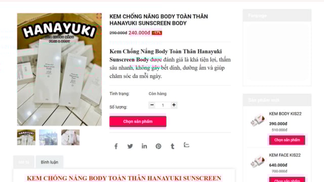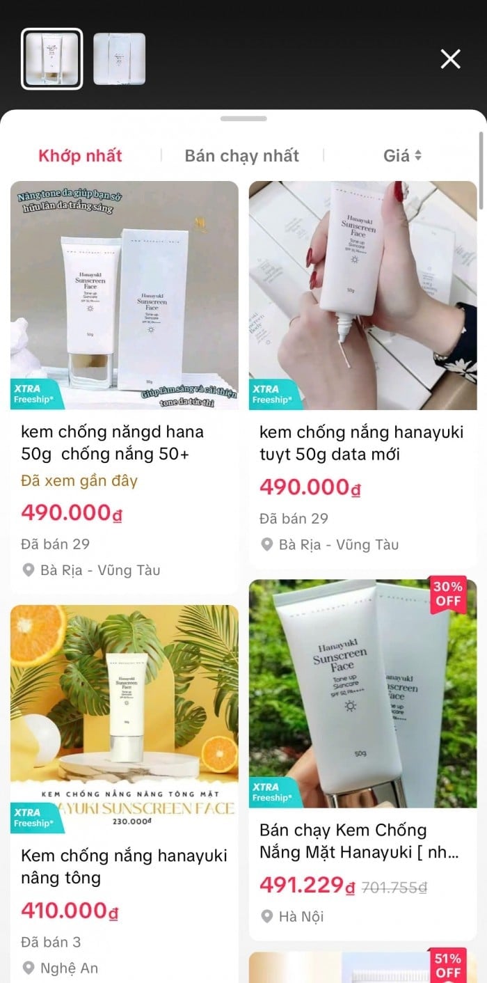 Thế nhưng, tính tới thời điểm hiện tại, khách hàng dễ dàng tìm mua các sản phẩm kem chống nắng Hanayuki trên nhiều sàn thương mại điện tử. Nhiều cửa hàng vẫn rao bán loại kem chống nắng này kèm loạt video quảng cáo với những lời cam kết "có cánh" về hiệu quả sau khi sử dụng sản phẩm này. Mức giá hiện tại của sản phẩm này trên các sàn thương mại điện tử dao động từ 240.000 - 500.000 đồng, con số chênh lệch khá lớn với mức giá 230.000 đồng trên trang bán hàng chính thức trước đây.