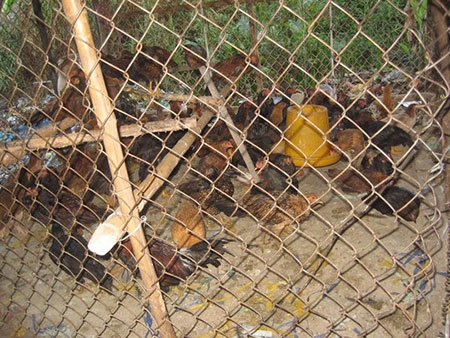 Nhiều con gà ủ rũ được nhốt vào chuồng chuẩn bị làm thịt vào rạng sáng mùng 3 |