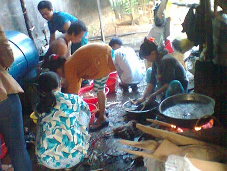 Mới 4 giờ sáng, lò giết mổ gia cầm chui bên hông chợ Bà Bộ đã đông nghịt khách hàng đến chọn mua những con gà ủ rũ đang nhốt trong chuồng với giá 110.000 đồng/kg. Cân xong, nhân viên của lò mổ cắt cổ, nhổ lông và chéo cánh gà cho khách với giá 10.000 đồng/con. Mọi hoạt động đều diễn ra ngay tại sàn nước cạnh nhà vệ sinh của gia đình trông rất cáu bẩn. Sát vách nhà vệ sinh, những chén huyết gà đầy ruồi nhặng được đặt la liệt.