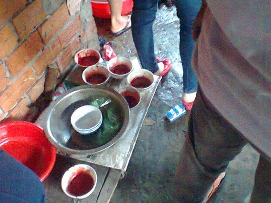 Những chén huyết gà được đặt bên cạnh nhà vệ sinh trông rất cáu bẩn |
