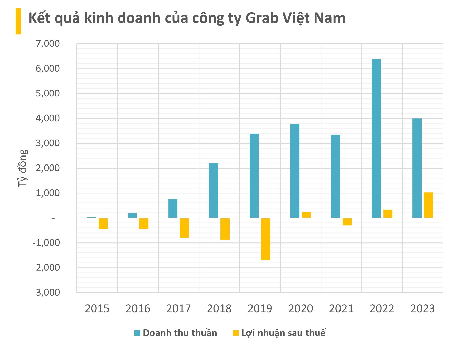 Năm 2022 cũng năm thứ 2 mà pháp nhân Grab Vietnam báo lãi, đạt 329 tỷ đồng. Năm 2023, dù doanh thu ghi nhận giảm xuống khoảng 4.000 tỷ đồng nhưng lợi nhuận tăng vọt lên khoảng 1.000 tỷ đồng.