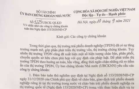 Ngay sau đó, ngày 10/9/2021, Ủy ban Chứng khoán Nhà nước đã có công văn gửi các công ty chứng khoán nhắc nhở về việc tuân thủ Nghị định 153/2020/NĐ-CP của Chính phủ quy định về chào bán, giao dịch trái phiếu doanh nghiệp riêng lẻ tại thị trường trong nước và chào bán trái phiếu doanh nghiệp ra thị trường quốc tế.