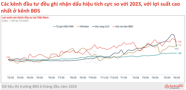 Theo công cụ Lịch sử giá của Batdongsan.com.vn, tính đến tháng 6/2024, giá rao bán trung bình của bất động sản tăng 24% so với thời điểm tháng 2/2023. Trong khi đó VNIndex, thể hiện biến động giá cổ phiếu, tăng 19%, giá vàng SJC tăng 17%, tỷ giá USD tăng 8%.