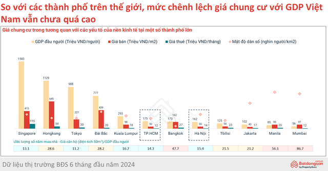 Dữ liệu từ Batdongsan.com.vn cho thấy so với các thành phố trên thế giới, mức chênh lệch giá chung cư với GDP Việt Nam chưa quá cao. Ước tính, để mua 1 căn hộ 50m2 ở Bangkok (Thái Lan), người dân mất hơn 47 năm thu nhập, con số này ở Manila (Philippines) là hơn 56 năm, ở Kuala Lumpur (Malaysia) là gần 17 năm. Còn ở Hà Nội và TP.HCM, người dân cần dành khoảng 14 – 15 năm thu nhập để mua một căn hộ diện tích tương tự.
