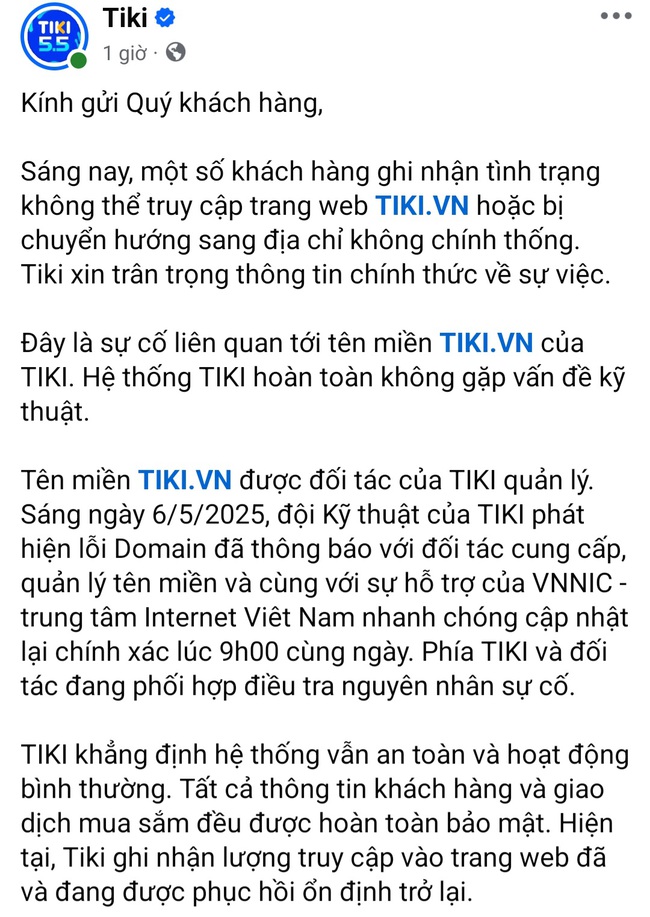 Đây là sự cố liên quan tới tên miền Tiki.vn của Tiki. Hệ thống Tiki hoàn toàn không gặp vấn đề kỹ thuật.