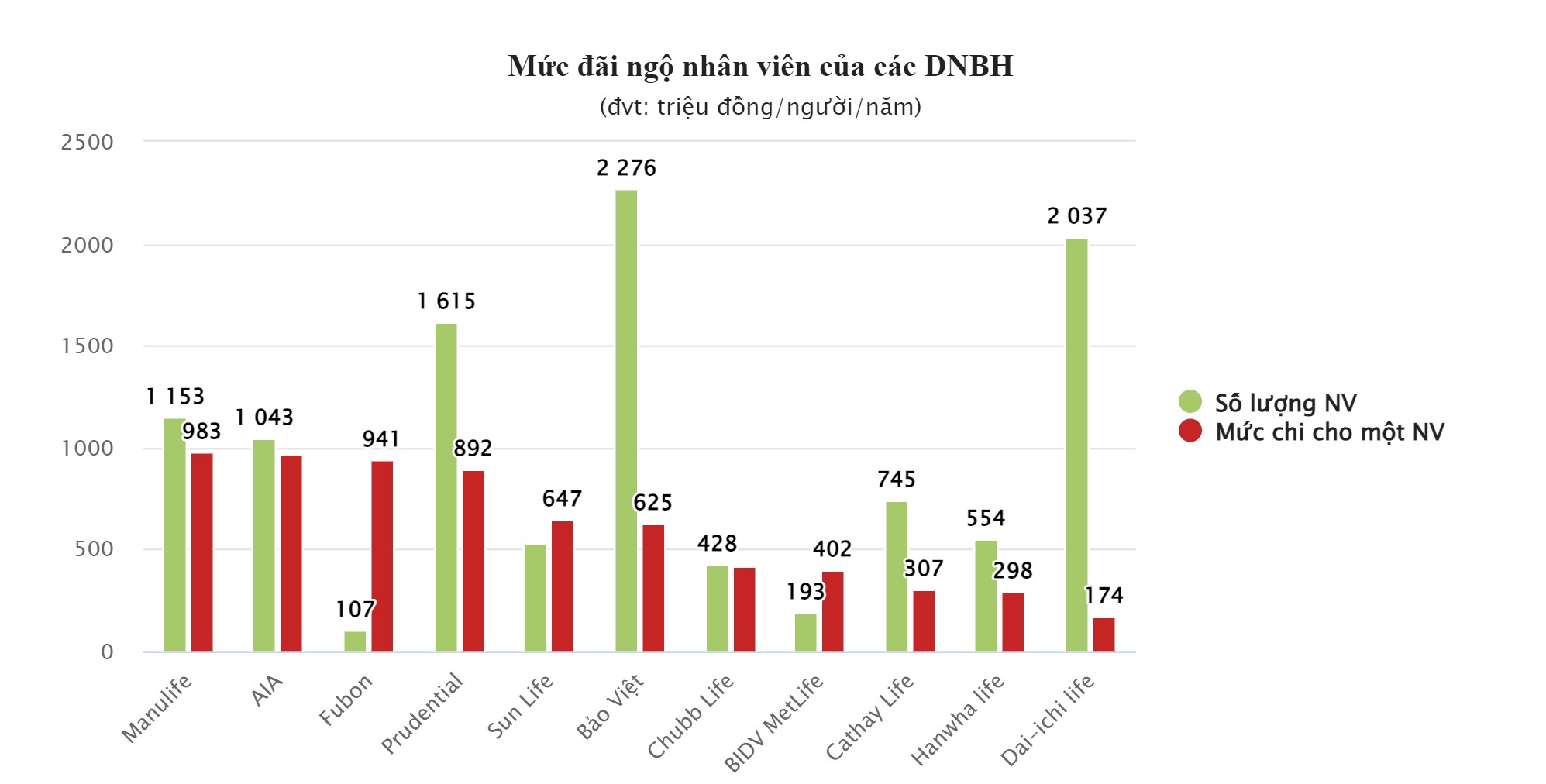 Bất ngờ hơn cả là đại gia đến từ Nhật Bản, Công ty TNHH Dai-ichi Life Việt Nam. Dù nằm trong Top 5 doanh nghiệp dẫn đầu về thị phần bảo hiểm nhân thọ, quy mô nhân sự cũng đứng thứ hai với 2.037 người vào cuối năm 2022, nhưng mức chi cho mỗi nhân viên chỉ là 174 triệu đồng trong năm vừa qua . Bình quân mỗi nhân viên Dai-ichi Life chỉ nhận 14,5 triệu đồng/tháng bao gồm lương và các khoản đóng theo lương.
