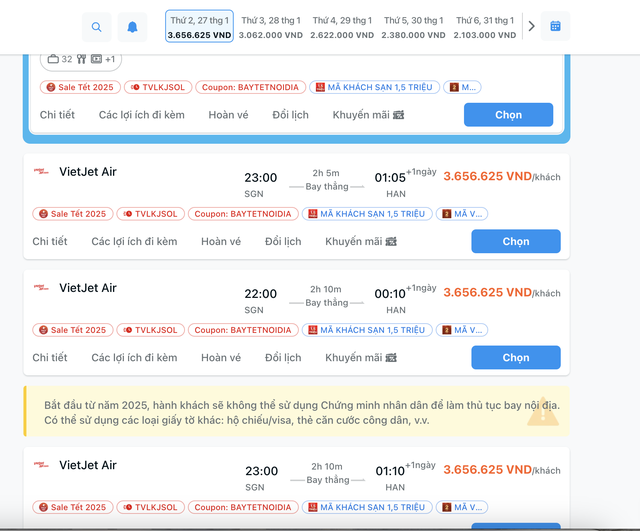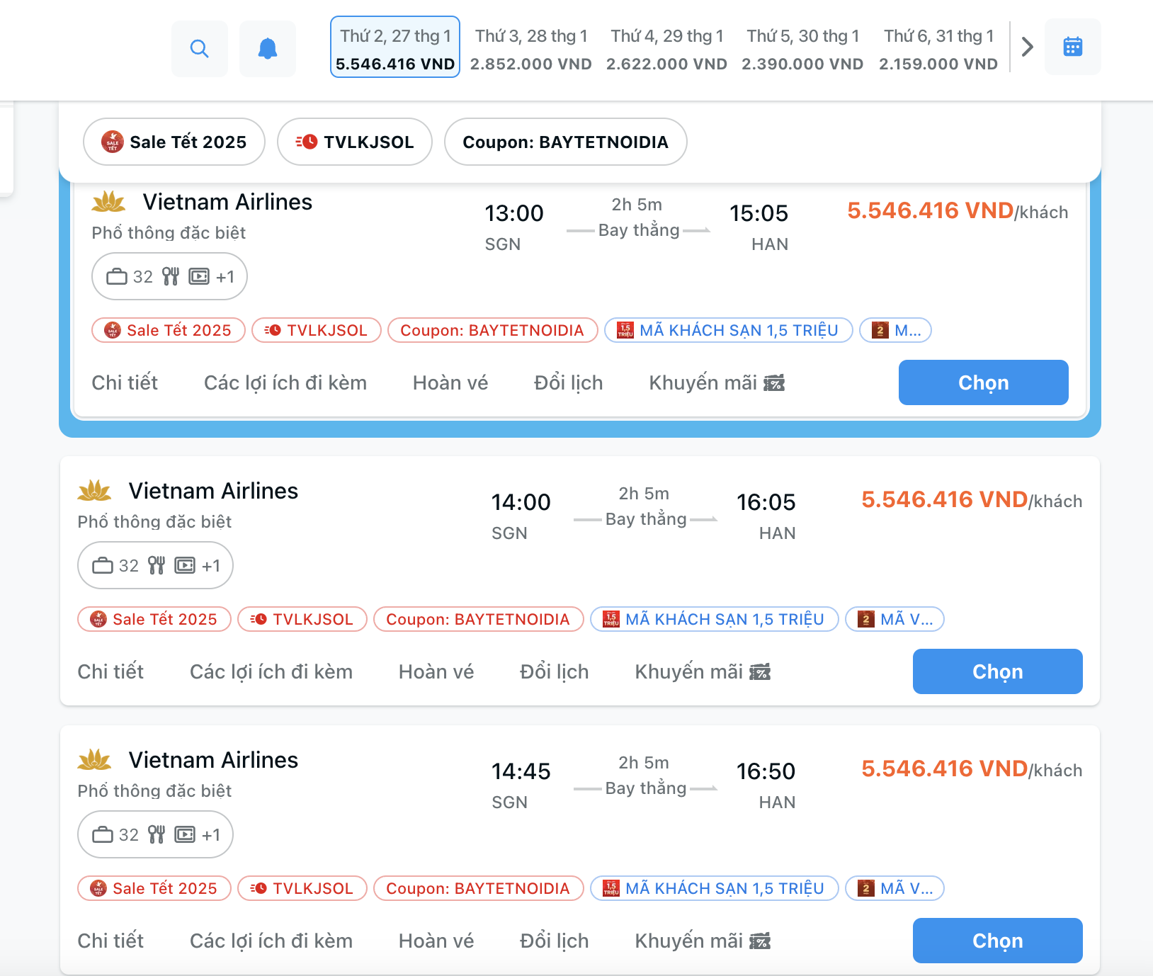 27/01/2025 17:13Bất ngờ giá vé máy bay TP HCM - Hà Nội ngày 28 Tết