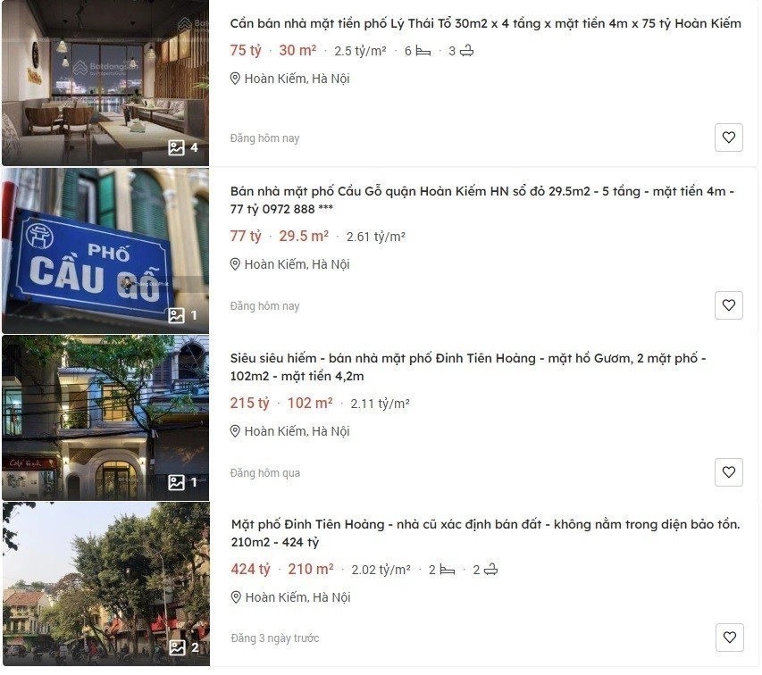 Đáng chú ý, tại các phố Lý Thái Tổ, Cầu Gỗ, Đinh Tiên Hoàng xuất hiện những căn nhà phố có giá bán dao động từ 2 - 2,6 tỷ đồng/m2. Đơn cử, một căn nhà tại phố Cầu Gỗ có diện tích khiêm tốn chỉ 29,5m2 đang được rao bán với 77 tỷ đồng, tương đương 2,61 tỷ đồng/m2. Có thể thấy, giá mỗi m2 của nhà này tương đương với giá một căn chung cư 2 phòng ngủ tại các quận Hoàng Mai, Nam Từ Liêm, Bắc Từ Liêm,... Người bán giới thiệu, vị trí căn nhà đối diện đài phun nước và nhìn thẳng ra hồ Gươm. Hiện căn nhà đang được cho thuê với giá 100 triệu đồng/tháng, hợp đồng kéo dài trong 5 năm.