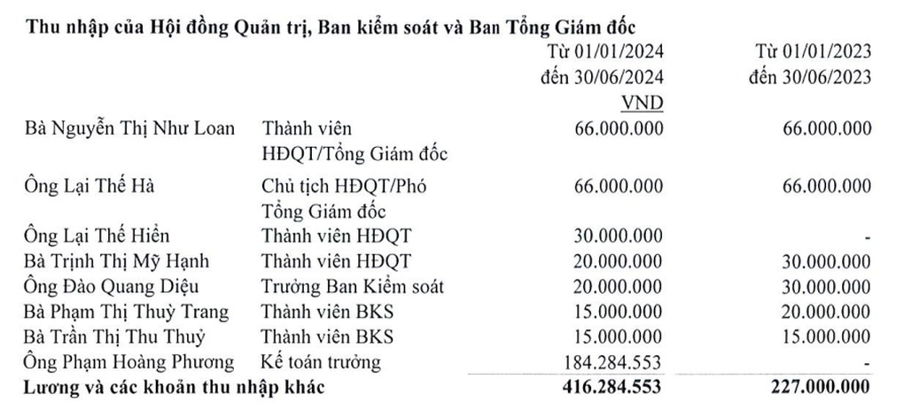 Cụ thể, trong nửa đầu năm nay, bà Nguyễn Thị Như Loan - tổng giám đốc kiêm thành viên HĐQT và ông Lại Thế Hà - chủ tịch HĐQT - nhận tổng thu nhập 66 triệu đồng. Tức bà Loan hay ông Hà nhận bình quân mỗi tháng 11 triệu đồng, báo Tuổi Trẻ thông tin.