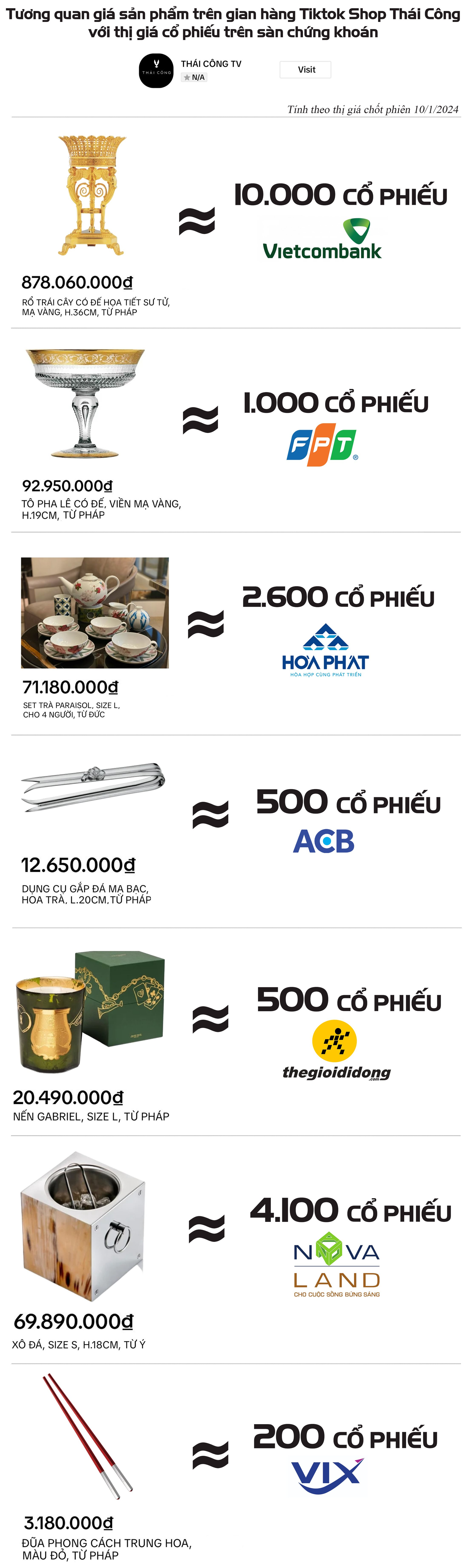 Set trà Paraisol từ Đức có mức giá hơn 71 triệu đồng tương đương với khoảng 2.600 cổ phiếu HPG trên sàn. Lọ nến Gabriel từ Pháp có giá hơn 20 triệu đồng tương đương với thị giá gần 500 cổ phiếu MWG của Thế giới Di động. Trong khi đó, đôi đũa nhập từ Pháp có giá hơn 3 triệu đồng tương đương với thị giá của khoảng 200 cổ phiếu Chứng khoán VIX.