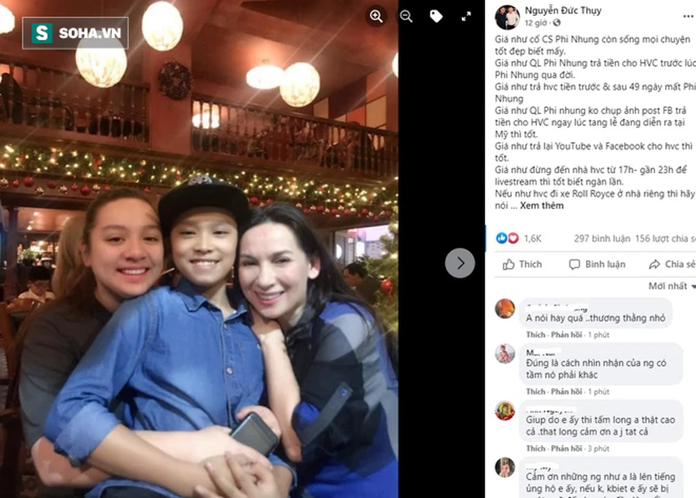 Rất nhiều những hiểu lầm suy nghĩ không đúng về câu chuyện này. Cường ơi, con bản lĩnh để vượt qua mọi đau thương mất mẹ và sớm lấy lại tinh thần để không phụ lòng mẹ Phi Nhung và khán giả yêu quý 2 mẹ con!", bầu Thụy bày tỏ quan điểm.