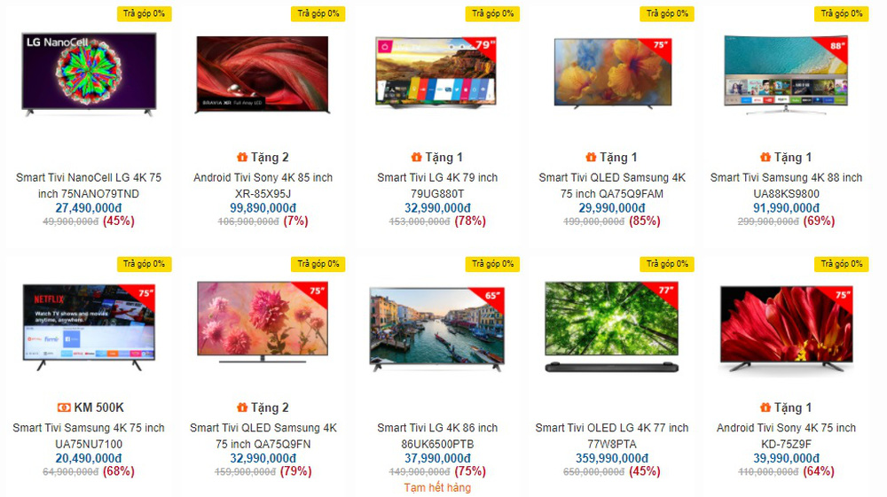 Trên một trang bán hàng của hệ thống siêu thị nổi tiếng đang tiến hành giảm giá mạnh các mẫu tivi. Tuy nhiên, giảm giá mạnh nhất là các sản phẩm thuộc nhóm có màn hình lớn, từ 75inch.
