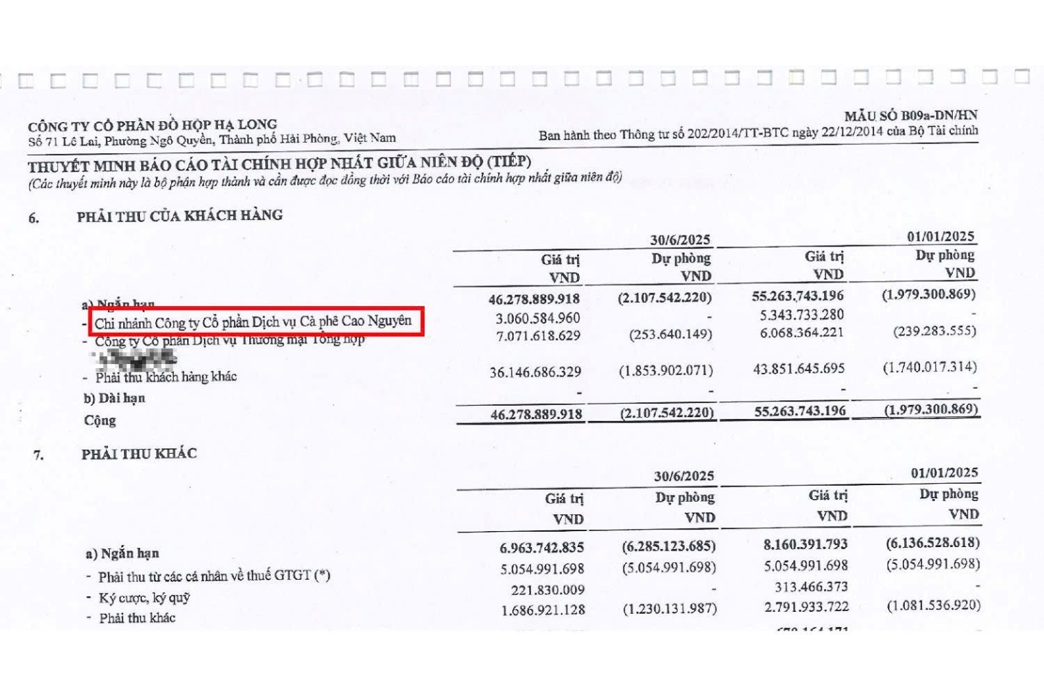 Cụ thể, tại trang 20, trong mục Thuyết minh báo cáo tài chính hợp nhất giữa niên độ số 6 về "Phải thu ngắn hạn khách hàng", Highlands Coffee được ghi nhận là một trong những khách hàng có giao dịch thường xuyên và đang có khoản công nợ lớn với Đồ hộp Hạ Long.