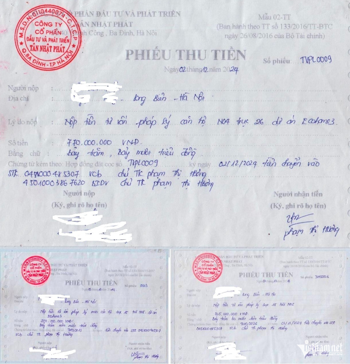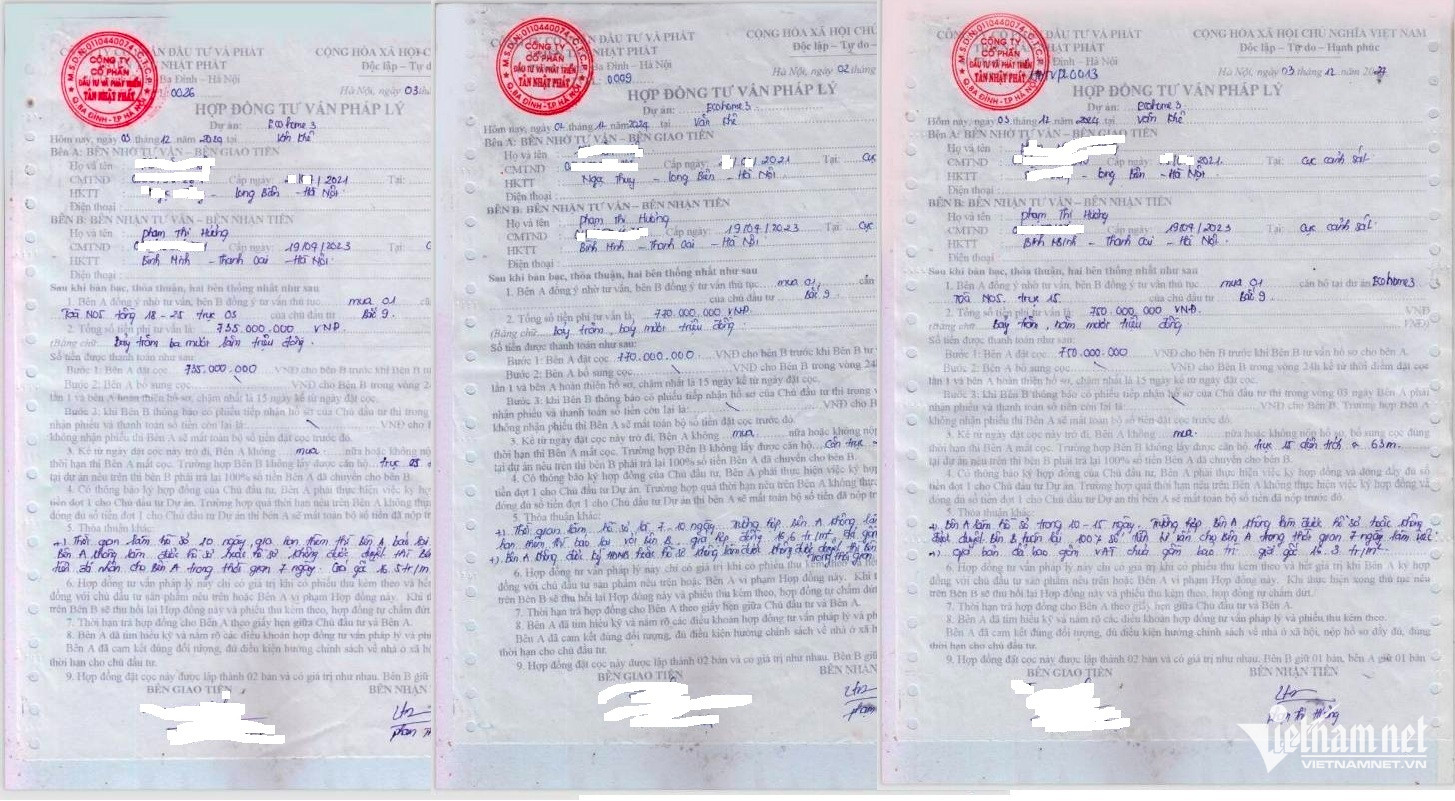 Đến ngày 31/12/2024, chị Đ.T.P - người có nhu cầu mua nhà - cũng tin vào “suất ngoại giao” của bà Phạm Thị Hương là kế toán trưởng Công ty Tân Nhật Phát - đã nộp tiền cọc mua căn hộ tại dự án Ecohome 3 nói trên.
