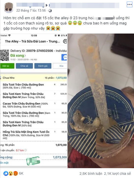26/07/2019 02:41Bị khách tố trà sữa có 'topping thạch sùng', The Alley chính thức lên tiếng và khẳng định sẽ chuyển toàn bộ hồ sơ sang cơ quan chức năng