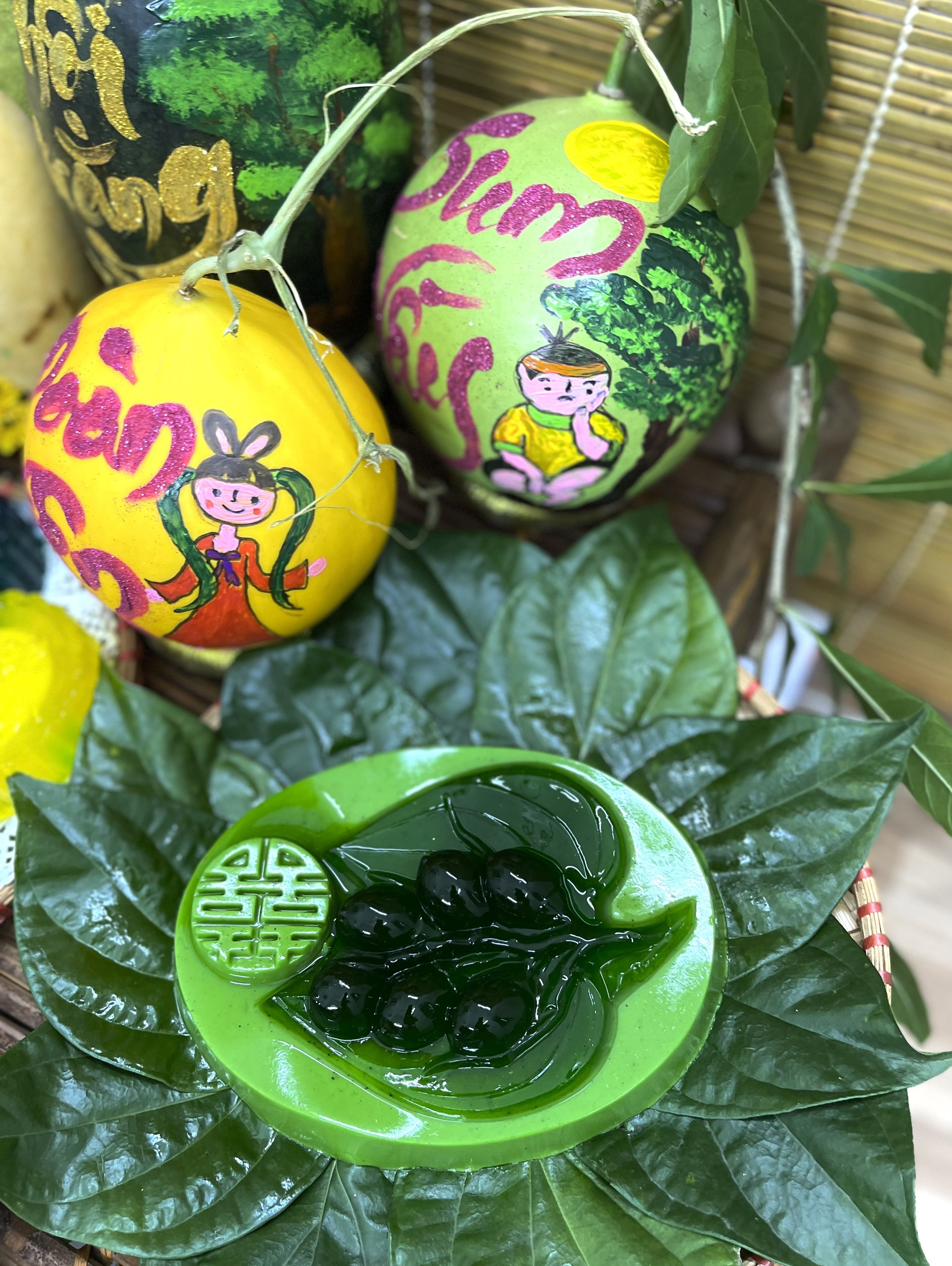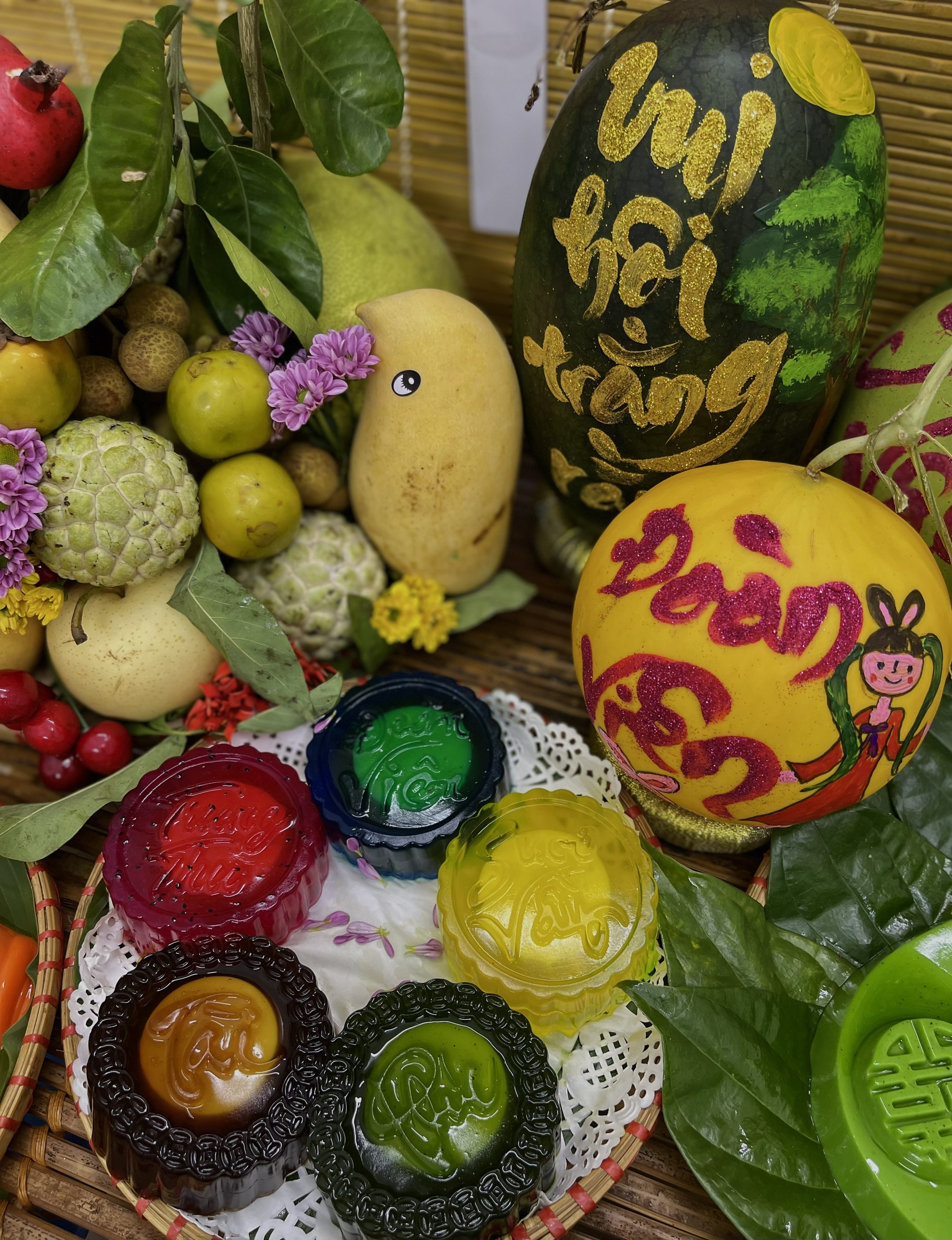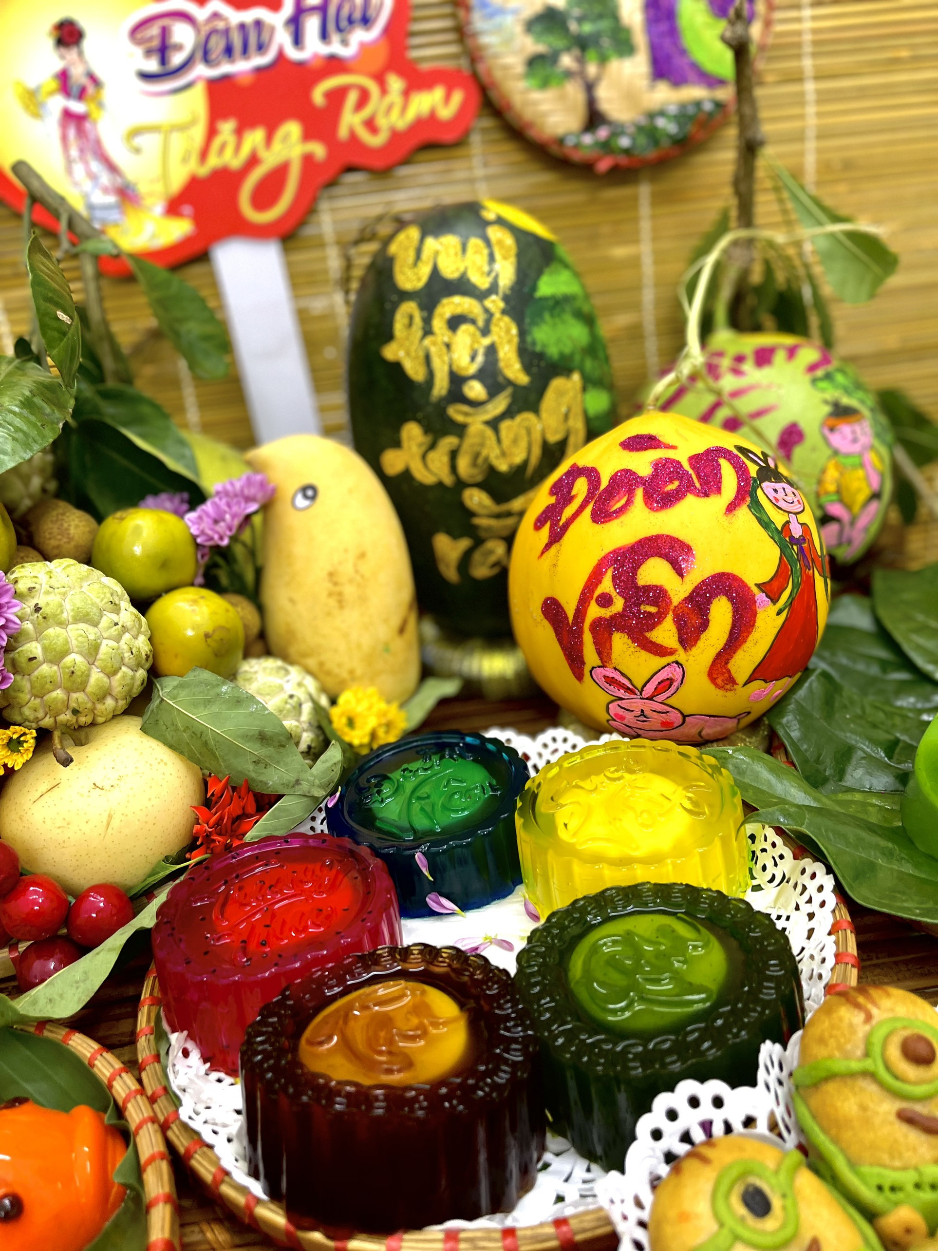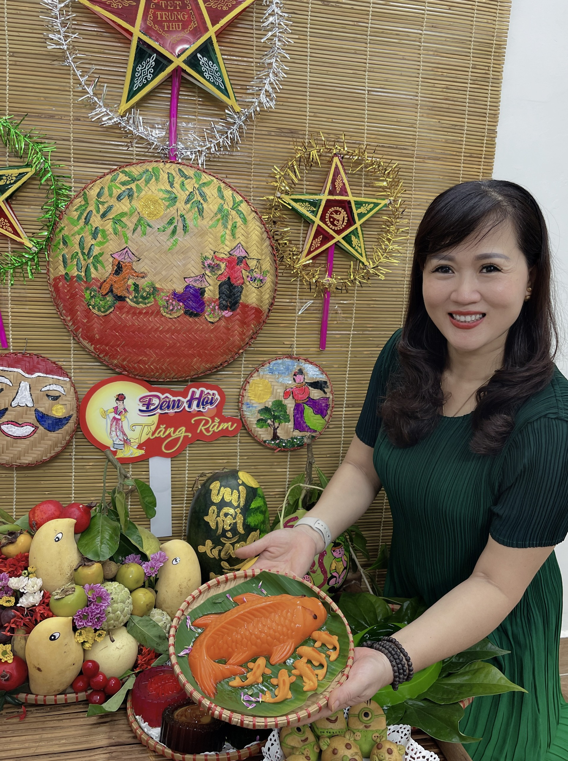 Tất cả những món đồ trên mâm cỗ trung thu này đều do chị Thuần tự lên ý tưởng, tự mua về và hì hụi cùng 2 học trò của mình cắt tỉa, sắp xếp bày biện. Mâm cỗ Trung thu hoành tráng, đủ sắc màu khiến ai cũng khen ngợi.